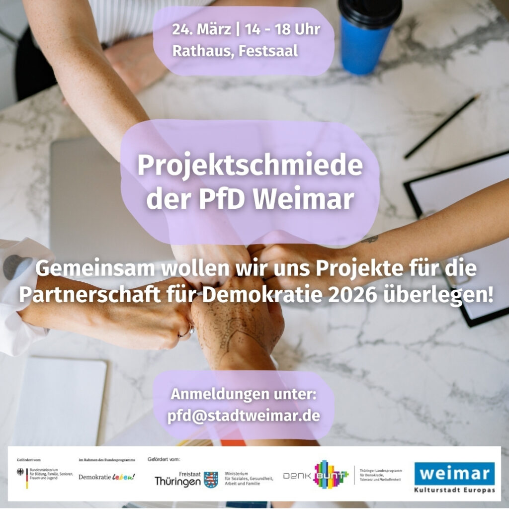Die Stadt Weimar lädt ein zur Projektschmiede der PfD Weimar. Wir wollen zusammen mit Trägern, Vereinen, Organisationen, etc. überlegen, welche Maßnahmen und Projekte in diesem Jahr in unserer Partnerschaft für Demokratie umgesetzt werden könnten.